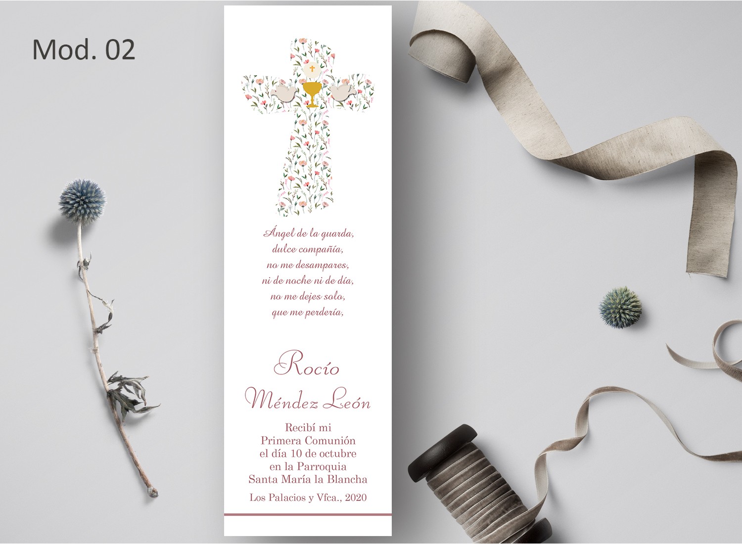 Diseñado con mimo y cuidado, se personaliza con el nombre del niño o niña, la fecha y los datos del evento, creando un recuerdo único y emotivo.
